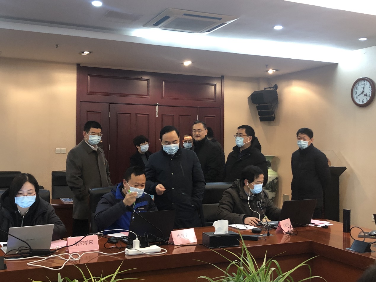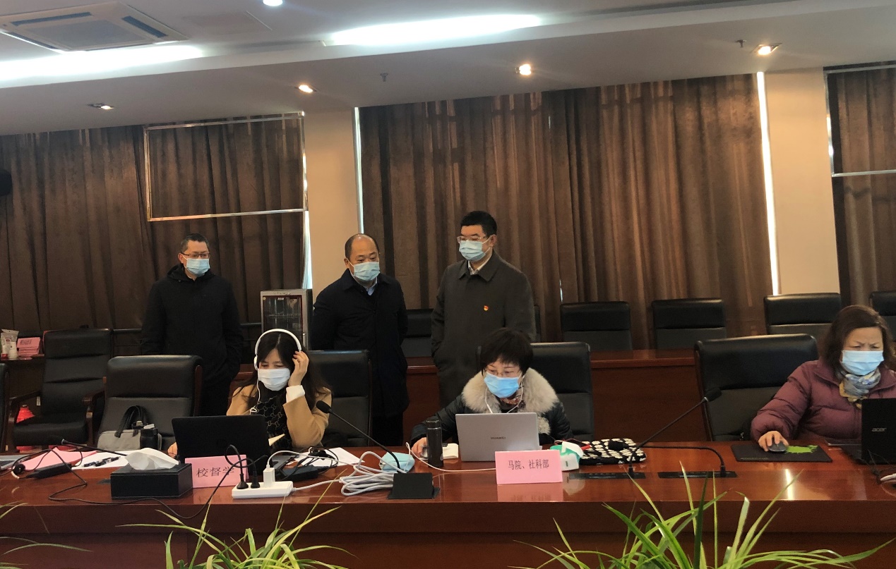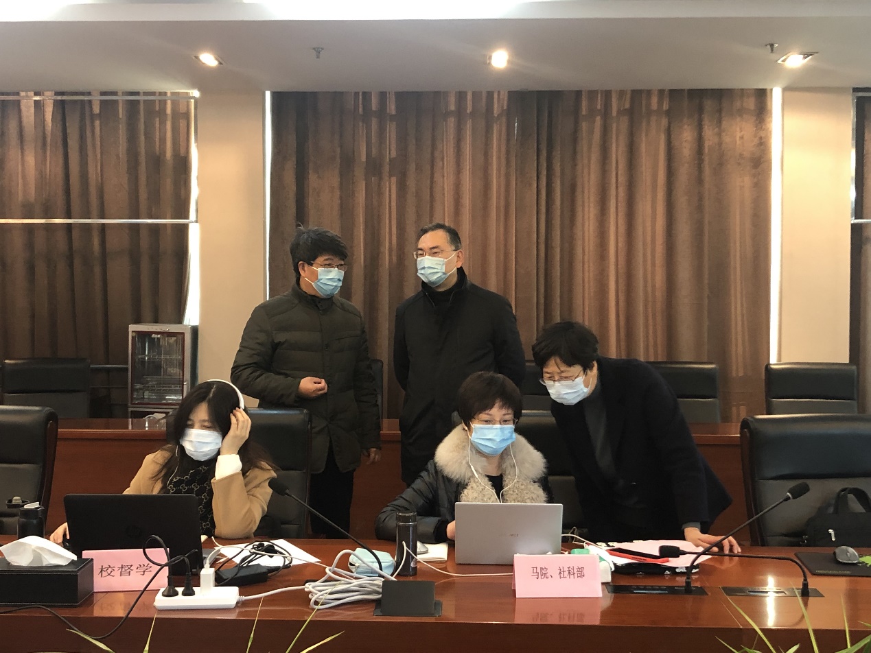 2月21日开学第一天上午,校党委书记吴学敏,党委副书记王伟,党委常委、副校长苏小冬,党委常委、纪委书记、省监委派驻监察专员于林惠,党委常委、副校长潘旭海等一行领导来到线上教学集中观测室,向各位督学详细询问了线上教学准备情况。